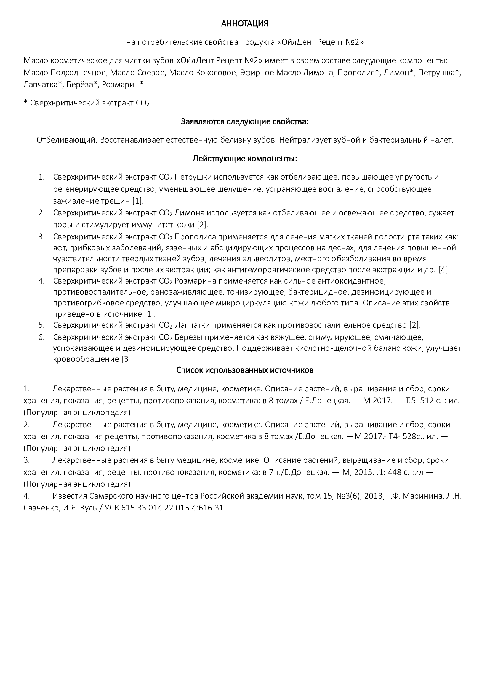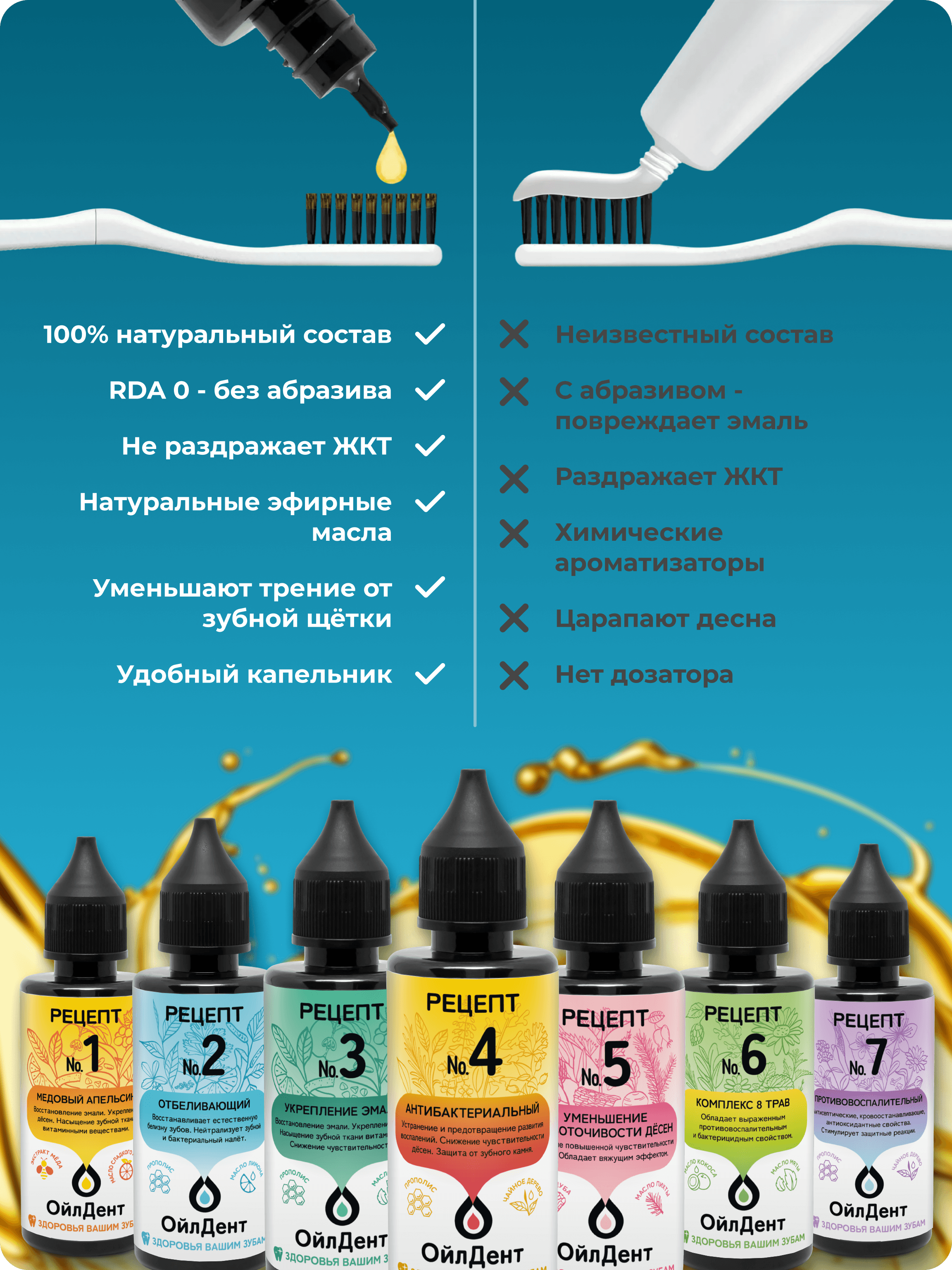 ОйлДент Рецепт №2 Отбеливающий — натуральное косметическое масло для ухода за полостью рта. Что делает: • Восстанавливает естественную белизну зубов • Нейтрализует зубной и бактериальный налёт • Укрепляет дёсен и питает зубную ткань витаминами и минералами • Освежает дыхание, дарит ощущение чистоты и лёгкости Преимущества ОйлДент: • Защищает эмаль от абразивного действия зубной щётки • Уменьшает давление щётки на дёсны • Глубоко питает дёсны и зубную ткань витаминами и минералами • 100% природный состав: масла, СО2‑экстракты и эфирные масла — без синтетических добавок Ключевые ингредиенты и действие: • Подсолнечное масло — богато витамином E, антивозрастное и регенерирующее • Соевое масло — витамины K и E, минералы для поддержки костной ткани • Кокосовое масло — лауриновая кислота: антимикробное действие, мягкое отбеливание • Эфирное масло лимона — обладает отбеливающим действием, укрепляет дёсны; использовать с осторожностью при беременности и кормлении грудью • СО2‑экстракты (берёза, лапчатка, лимон, петрушка, чайное дерево, прополис) — отбеливают, дезинфицируют, снимают воспаление, тонизируют и защищают слизистую полости рта Способ применения: • На зубную щётку 5–10 капель, чистить 2–3 минуты. Щётку промыть с мылом и горячей водой. • В ложку 15–20 капель, полоскать рот 10–15 минут; горло 3–5 минут. Не глотать, выплюнуть в унитаз, не в раковину. Состав: • подсолнечное, соевое, кокосовое масла; • эфирное масло лимона; • СО2‑экстракты: берёза (почки), лапчатка (корень), лимон (цедра), петрушка (семена), чайное дерево (лист), прополис; • комплекс биологически активных веществ (воск, жирные кислоты, карнозоловая кислота, сквален, терпеноиды, фитостерины, флавоноиды). Объём: 50 мл.