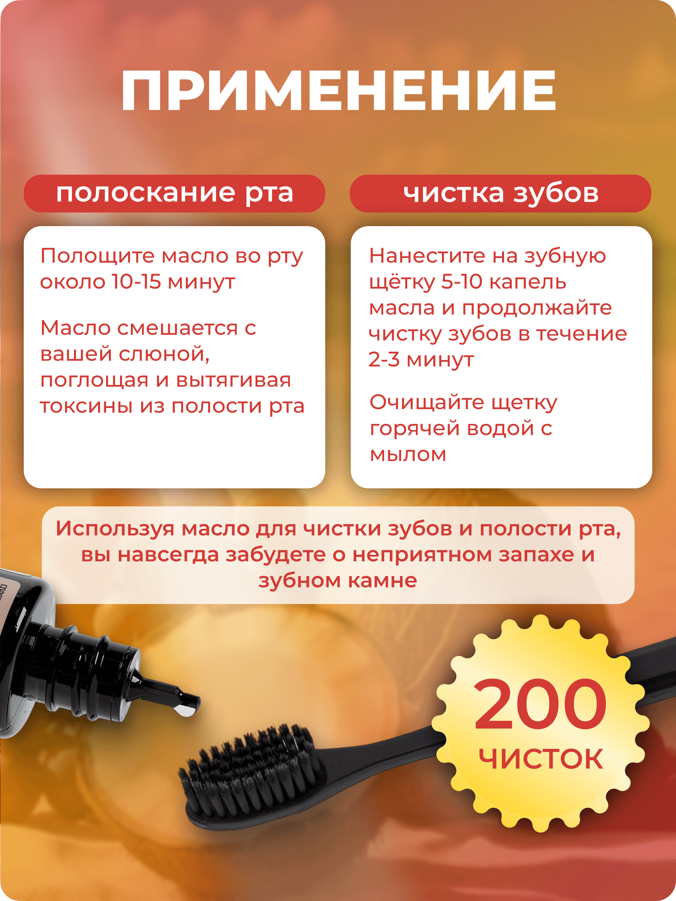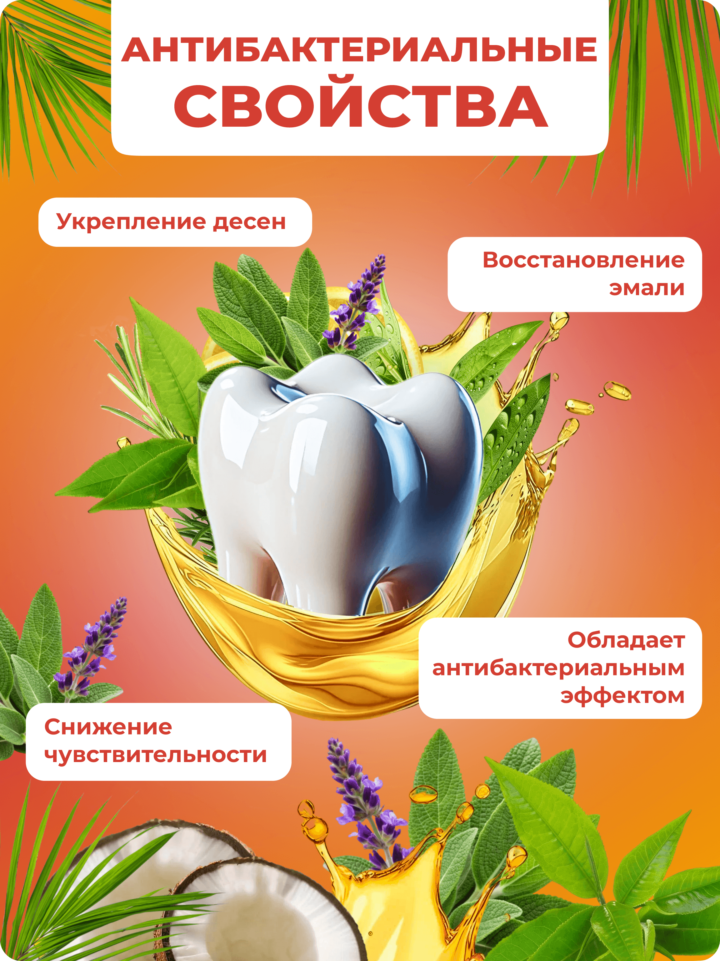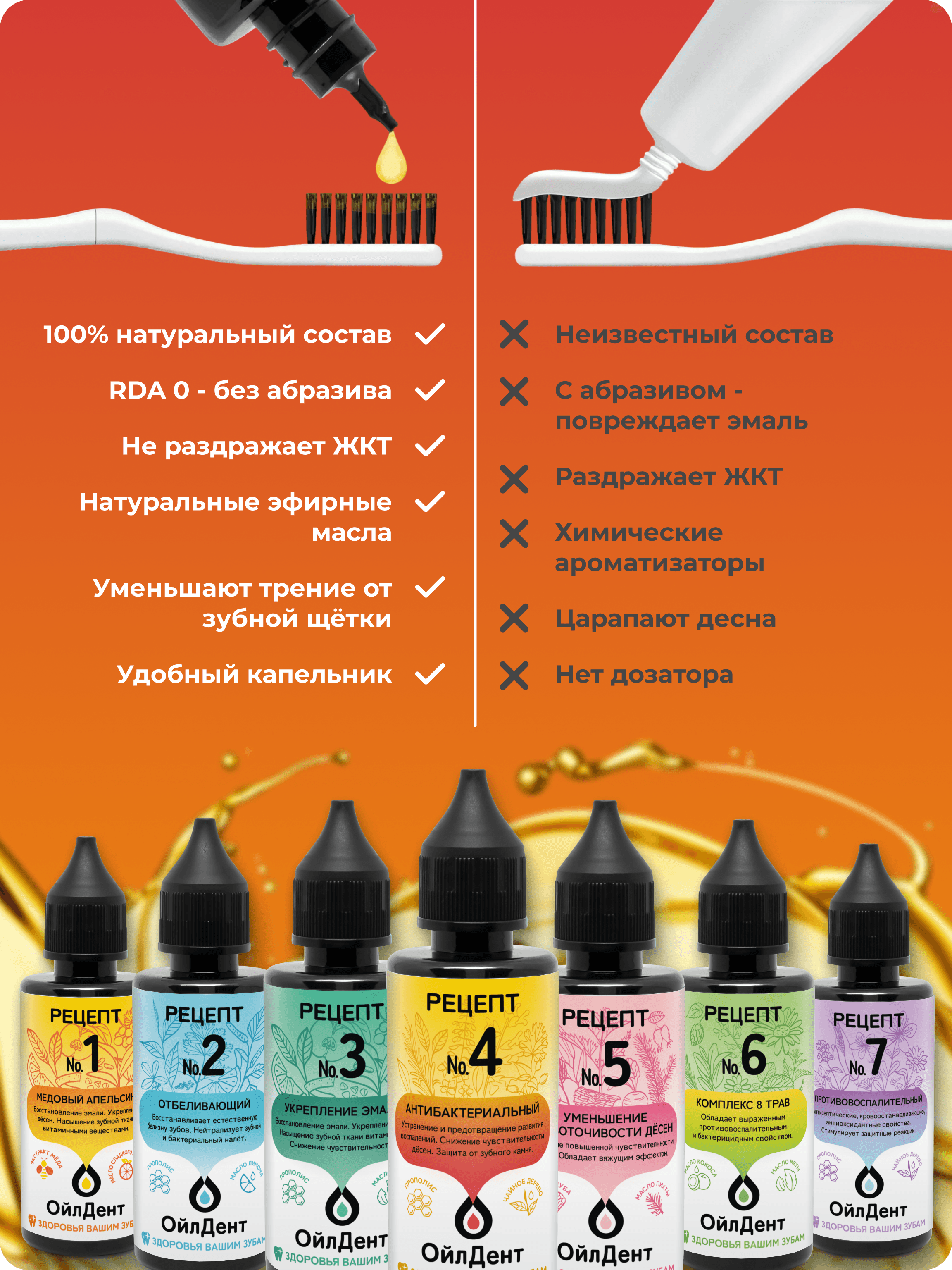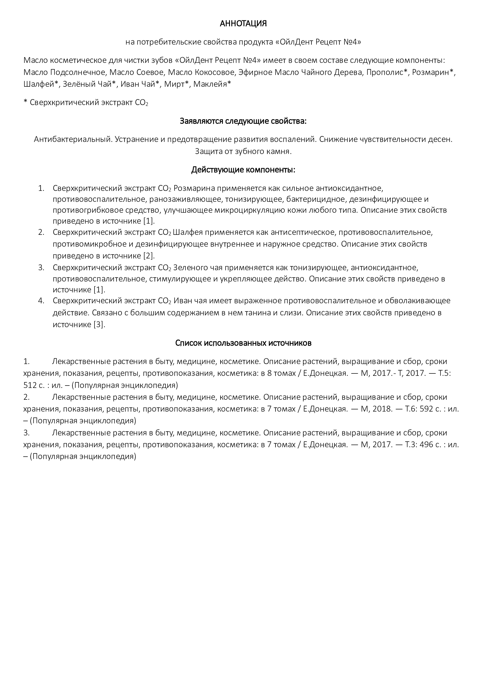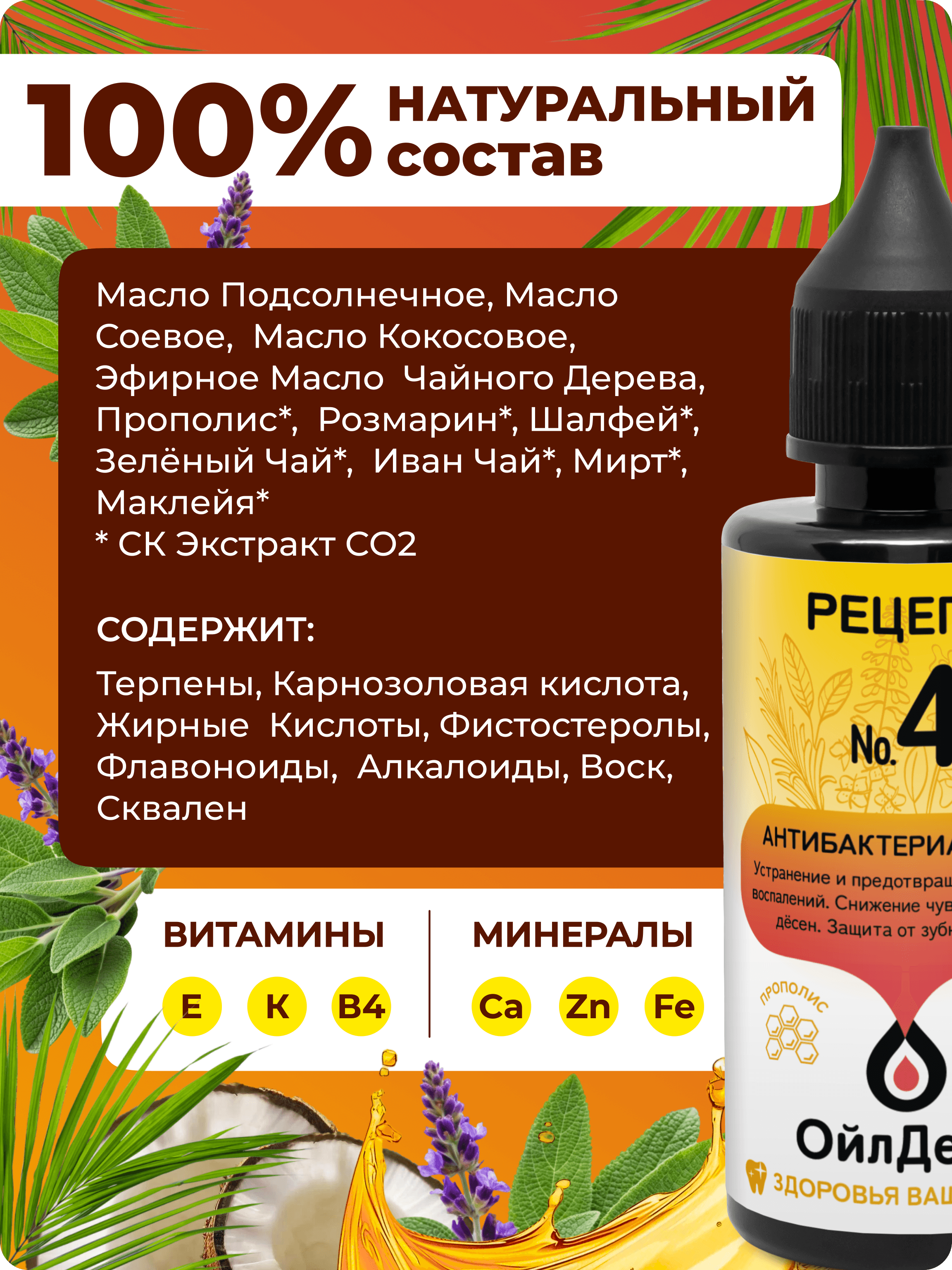 ОйлДент Рецепт №4 Антибактериальный — натуральное косметическое масло для ухода за полостью рта. Что делает: • Устраняет и предотвращает развитие воспалений • Снижает чувствительность дёсен • Защищает от образования зубного камня • Освежает дыхание и поддерживает ощущение чистоты Преимущества ОйлДент: • Защищает эмаль от абразивного действия зубной щётки • Уменьшает давление щётки на дёсны • Глубоко питает дёсны и зубную ткань витаминами и минералами • 100% природный состав: масла, СО2‑экстракты и эфирные масла — без синтетических добавок Ключевые ингредиенты и действие: • Подсолнечное масло — витамин E, антиоксидантное и регенерирующее действие • Соевое масло — витамины K и E, минералы для поддержки костной и зубной ткани • Кокосовое масло — лауриновая кислота: антимикробное действие, мягкое отбеливание • Эфирное масло чайного дерева — мощное дезинфицирующее и противовоспалительное средство; успокаивает зубную боль; использовать с осторожностью при беременности и кормлении грудью • СО2‑экстракты (иван‑чай, маклейя, мирт, розмарин, зелёный чай, шалфей, прополис) — антисептическое, ранозаживляющее, тонизирующее и противовоспалительное действие для слизистой полости рта Способ применения: • На зубную щётку 5–10 капель, чистить 2–3 минуты. Щётку промыть с мылом и горячей водой. • В ложку 15–20 капель, полоскать рот 10–15 минут; горло 3–5 минут. Не глотать, выплюнуть в унитаз, не в раковину. Состав: • подсолнечное, соевое, кокосовое масла; • эфирное масло чайного дерева; • СО2‑экстракты: иван‑чай (лист), маклейя (трава), мирт (лист), розмарин (лист и побеги), зелёный чай (лист), шалфей (побеги), прополис; • биологически активные вещества: алкалоиды (противовоспалительное и обезболивающее действие), воск (бактерицидный и вяжущий эффект), жирные кислоты (омега‑3/6 — противовоспалительные), карнозоловая кислота, сквален, терпены, фистостеролы, флавоноиды — вместе обеспечивают антибактериальную, противовоспалительную, ранозаживляющую и укрепляющую активность.