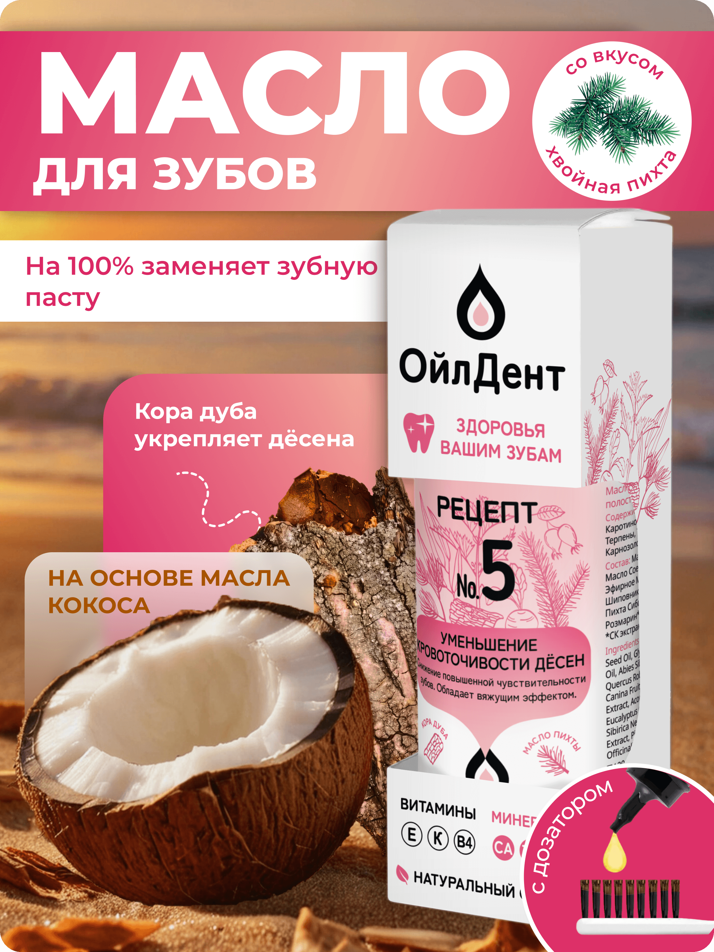 ОйлДент Рецепт №5 Уменьшение кровоточивости дёсен — натуральное косметическое масло для ухода за полостью рта. Что делает: • Уменьшает кровоточивость дёсен • Снижает повышенную чувствительность зубов • Обладает вяжущим эффектом, способствует заживлению мелких ран и трещин • Освежает дыхание и укрепляет капилляры слизистой Преимущества ОйлДент: • Защищает эмаль от абразивного действия зубной щётки • Уменьшает давление щётки на дёсны • Глубоко питает дёсны и зубную ткань витаминами и минералами • 100% природный состав: масла, СО2‑экстракты и эфирные масла — без синтетических добавок Ключевые ингредиенты и действие: • Подсолнечное масло — витамин E, антиоксидантное и регенерирующее действие • Соевое масло — витамины K и E, минералы для поддержки костной и зубной ткани • Кокосовое масло — лауриновая кислота: антимикробное действие и мягкое отбеливание • Эфирное масло пихты — антисептическое и противовирусное действие; использовать с осторожностью при беременности, противопоказано детям до 6 лет • СО2‑экстракты (аир, дуб, ель, крапива, пихта сибирская, репа, шиповник, эвкалипт) — вяжущее, ранозаживляющее, тонизирующее, антисептическое и укрепляющее действие, предотвращают кровоточивость и улучшают восстановление тканей Способ применения: • На зубную щётку 5–10 капель, чистить 2–3 минуты. Щётку промыть с мылом и горячей водой. • В ложку 15–20 капель, полоскать рот 10–15 минут; горло 3–5 минут. Не глотать, выплюнуть в унитаз, не в раковину. Состав: • подсолнечное, соевое, кокосовое масла; • эфирное масло пихты; • СО2‑экстракты: аир (корень), дуб (кора), ель (хвоя), крапива (трава), пихта сибирская (хвоя), репа (плод), шиповник (плод), эвкалипт (лист); • биологически активные вещества: дубильные вещества (вяжущее, противовоспалительное и кровоостанавливающее действие), карнозоловая кислота, каротиноиды, полипренолы, терпеноиды, терпены, флавоноиды — совместно обеспечивают антиоксидантную, противовоспалительную, ранозаживляющую и укрепляющую активность.